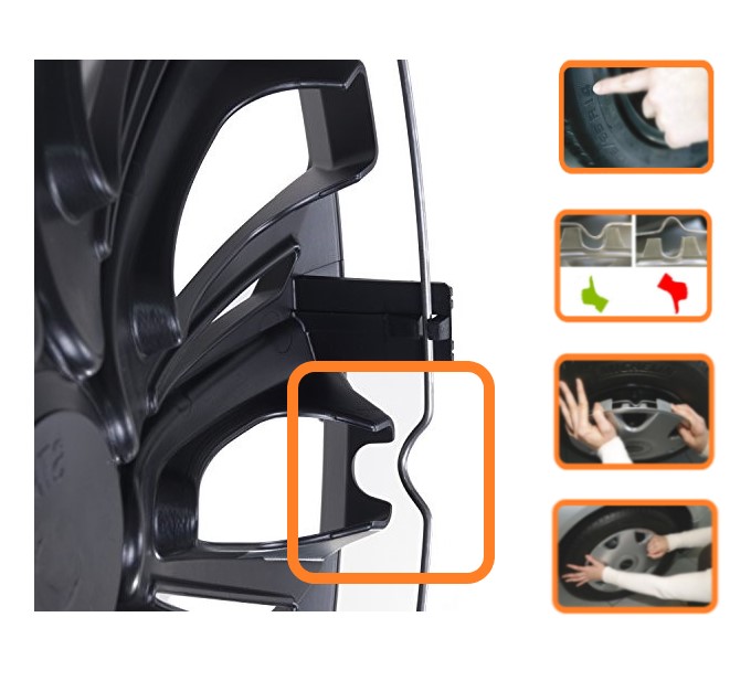 Montaż jest niezwykle prosty – polega na wciśnięciu kołpaka na felgę poprzez metalowy pierścień dociskowy. W każdym kołpaku został przygotowany otwór na wentyl.