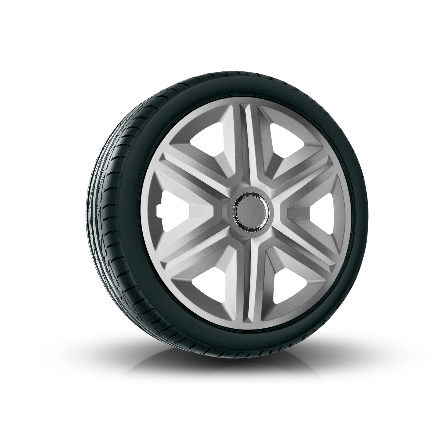 Komplet wysokiej jakości kołpaków wykonanych z tworzywa odpornego na uderzenia i warunki atmosferyczne. Kołpaki pasują do felg stalowych większości modeli samochodów (nie pasują jedynie do felg wypukłych).